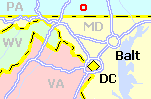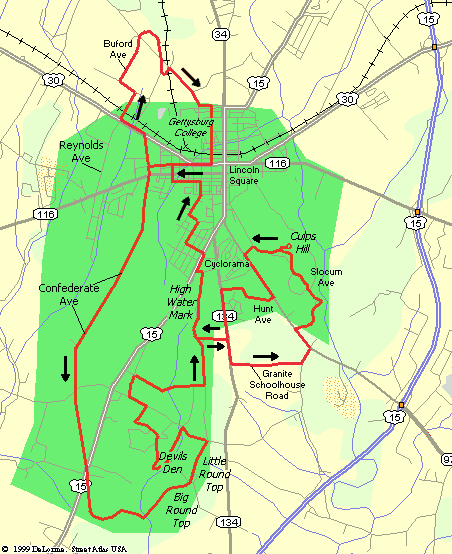 The town of Gettysburg, PA, location of the famous Civil War Battlefield, is about a 1½ hour drive from the Capital Beltway. However once you arrive at Gettysburg, the best way to experience the beautiful countryside around the battlefield is by bicycle. When my wife and I rode this route in July 2001, we decided to rent a tandem bicycle from Blazing Saddles (which has since gone out of business). The suggested starting point is the Visitor Center Parking Area, located just south of the Business 15 and SR 134 intersection on the south side of town. From here, the route heads north through through the back streets of Gettysburg After passing through town, the route basically makes three circles outside of town. First, the route makes a loop north of town, passing the Eternal Light Peace Memorial and Gettysburg College. The second loop takes you south around the main battlefield, and includes a "nice" climb Little Round Top. The third loop follows the lesser traveled roads around Culps Hill. Just prior to completing the ride, the route passes the High Water Mark, which many consider to be the turning point in the war. As you cycle around the battlefield, be sure to stop and climb up a few of the observation tower for some really great panoramas of the surrounding countryside. From the Capital Beltway, take I-270 North to Frederick, MD. At Frederick, continue straight onto Route 15 North, passing Thurmont and the Mason-Dixon Line. Take the Route 134 exit (Taneytown Rd) which will take you up to the Visitor Center. |