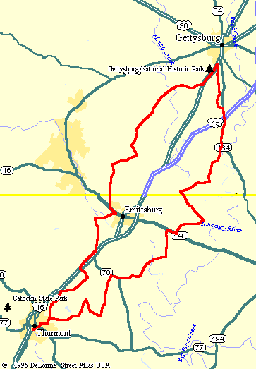 Here's a great route I did with Potomac Pedalers. Ride leader Lanny Evans put this together from two rides listed in Chuck & Gail's.This route wanders the lightly traveled backroads between Thurmont, Md and Gettysburg, Pa. Even though this is a fairly hilly area of the country, this trail follows a fairly reasonable terrain. There are a few hills, but nothing really bad. The route also travels through the historic battlefield near Gettysburg. The route starts in Thurmont, which is about an hour drive north of the Washington Beltway. Take I-270 North to Frederick. I-270 goes strait into Route 15, which will take you farther north to Thurmont. When you take the exit off route 15 at Thurmont, make a right at the bottom of the ramp and then a left at the next light (there are several fast food restaurants here). The ride start in the community park about a half mile up the road on the left. |